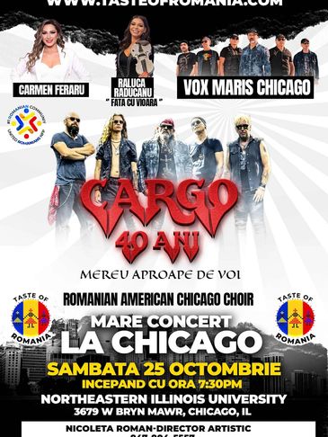 Romanians of DC și Taste of Romania au plăcerea de a anunța un concert live special cu legendara trupă rock românească Cargo, parte a Turneului Aniversar 40 de Ani, care va avea loc vineri, 7 noiembrie 2025, de la ora 20:00. Evenimentul va avea loc la Clarendon Ballroom (3185 Wilson Boulevard, Arlington, VA) și o va avea ca invitată pe R